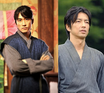 Pendukung dua watak ini ialah Osawa Takao untuk Minakata Jin dan Song Seung Heon untuk Jin Hyuk. Dua aktor ini memang terkenal la kat jepun dan korea. Kalau dilihat secara kasar im very sure semua orang akan cakap Jin Hyuk lebih hensem berbanding minakata Jin hehehe......(memang pun sebenarnya....) Tapi actually minakata jin pun hensem juga ar. Jujurnya aku memang tak kenal siapa Osawa Takao ni berbanding dengan Song Seung Heon yang memang aku minat sejak tengok dia berlakon citer Autumn In My Heart. By age memang Osawa Takao lebih tua (tahap aku boleh panggil pakcik dah) berbanding Song Seung Heon, (bakal aku panggil pakcik) tapi aku boleh tergoda melihat kecomelan beliau. Jarang sangat aku nak tergoda dengan pelakon jepun nih.....lain lah kalau Oguri Shun ke Tomoya Nagase ke, memang aku sangat-sangat jarang untuk tergoda dengan hero yang lebih tua. So kira pakcik ni bertuah la kerana berjaya membuatkan aku tergoda dengan dia hehehe.